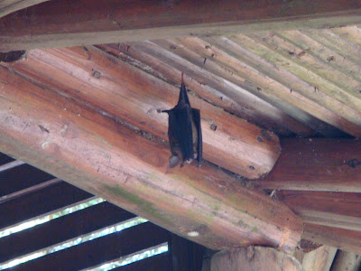 這隻蝙蝠在涼亭上睡覺 睡到一隻腳都掉下來嚕 真是好玩
